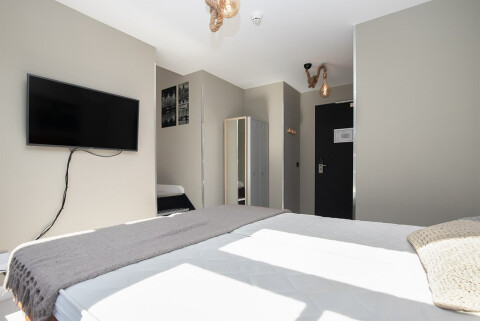 These beautifully fully 2-room is located on the 1st floor of the building. All apartments have their own kitchen with hob, extractor and fridge. All studios are also equipped with a double bed, private bathroom with shower and toilet. All studios also have their own TV. Seating area or table where you can sit.
