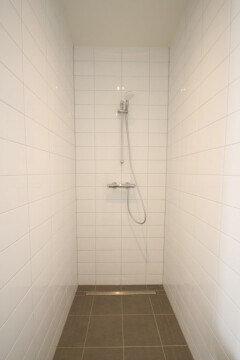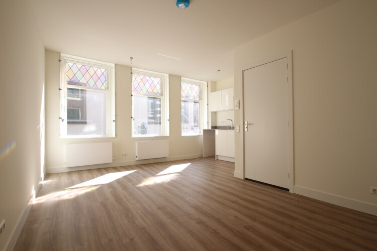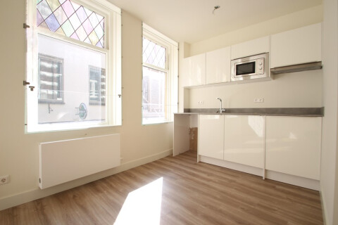Deze prachtig gerenoveerde studio is gelegen op de 1e verdieping van het pand. De studio beschikt over een luxe keuken met koelkast, combi oven/magnetron, kookplaat en afzuigkap. Er is tevens aansluiting voor een wasmachine. De badkamer is v.v. een douche, wastafel en toilet. De gehele studio is uitgerust met een pvc vloer. Tevens kenmerkt deze studio zich door prachtige glas en loodramen. Kortom een prachtige studio op een unieke locatie.