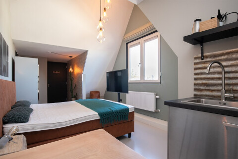 These beautifully fully furnished studios are located on the 1st and 2nd floor of the building. All studios have their own kitchen with hob, extractor and fridge. All studios are also equipped with a double bed, private bathroom with shower and toilet. All studios also have their own TV. Seating area or table where you can sit.