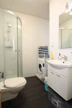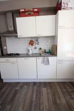 Deze knusse studio is gelegen op de begane grond van het pand en bij binnenkomst heeft u aan de overzijde de open keuken die is v.v. een koelkast, vaatwasser, 4-pits afzuigkap en kookplaat. De badkamer is gelegen achter de keuken en is v.v. een douche, wastafel, toilet n wasmachine aansluiting.